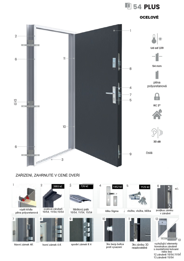 • součástí dveří je ocelová zárubeň v barvě křídla, pokrytá termofólií tl.1,5mm s těsněním + hliníkový práh,