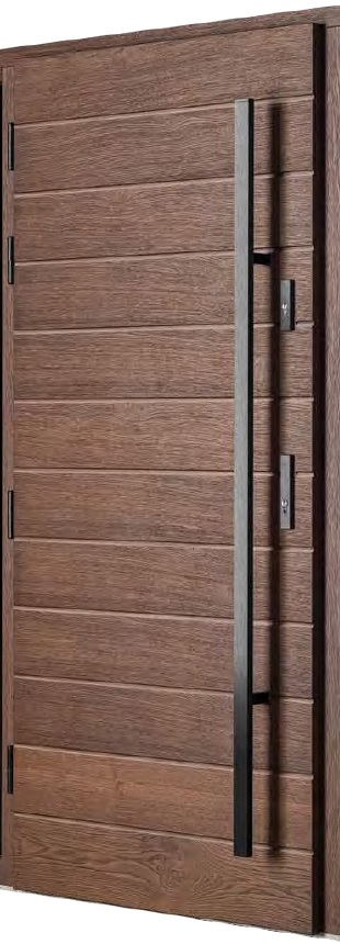 • vysoce pevná konstrukce dřevěných dveří s borovicovým rámem a s ocelovou stabilizační výztuhou (na straně zámku), ozdobná voděodolná deska vyplněná polyuretanovou pěnou, falcová konstrukce dveří,