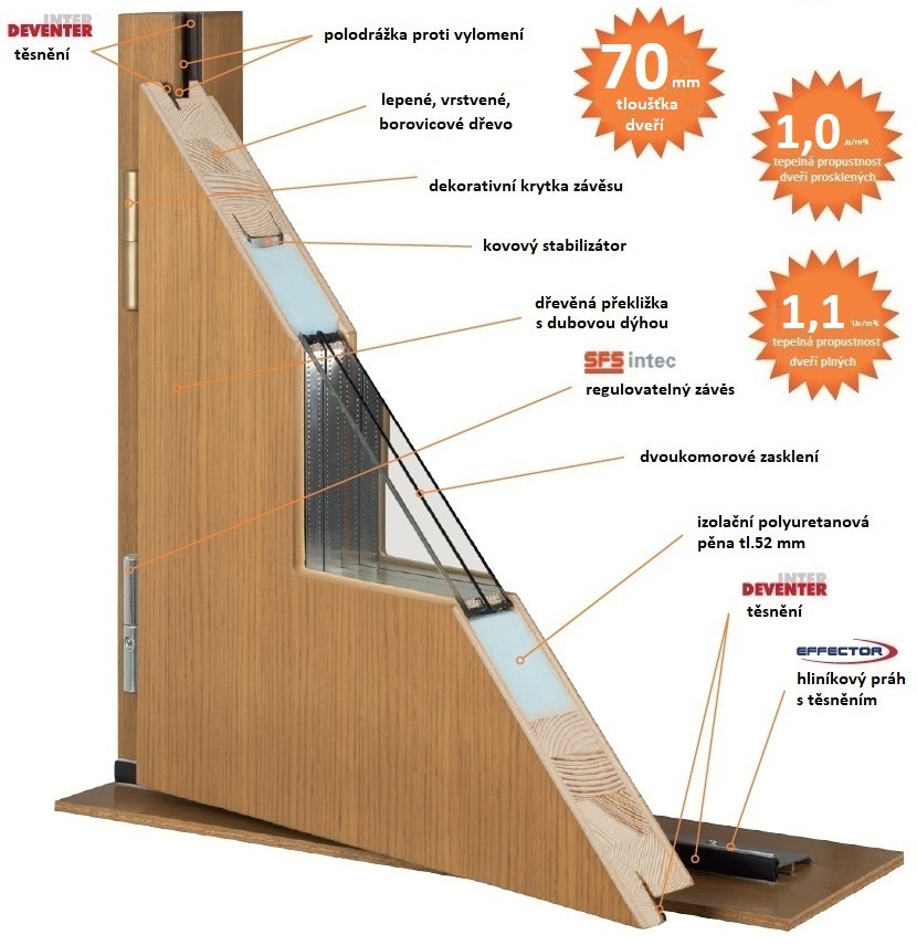 • vysoce pevná konstrukce dřevěných dveří s borovicovým rámem a s ocelovou stabilizační výztuhou (na straně zámku), ozdobná voděodolná deska vyplněná polyuretanovou pěnou, falcová konstrukce dveří,